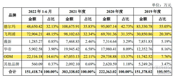 而品牌“飞利浦”的主营业务收入占比则从2019年的20%左右,一路攀升到2022上半年的48%,几乎占据了其主营业务收入的半壁江山。