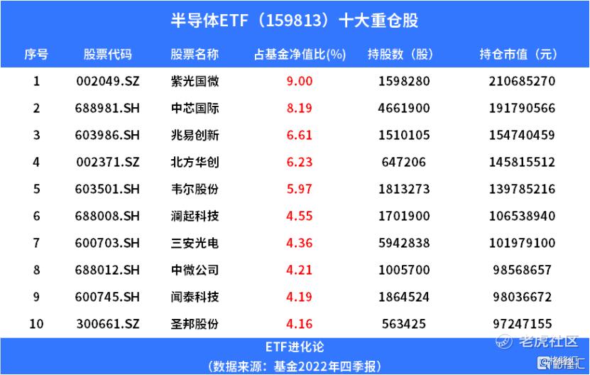 半导体ETF(159813)的重仓股有中芯国际、北方华创、韦尔股份、兆易创新、紫光国微、中微公司等半导体产业链龙头公司,成分股包含30只半导体芯片公司。
