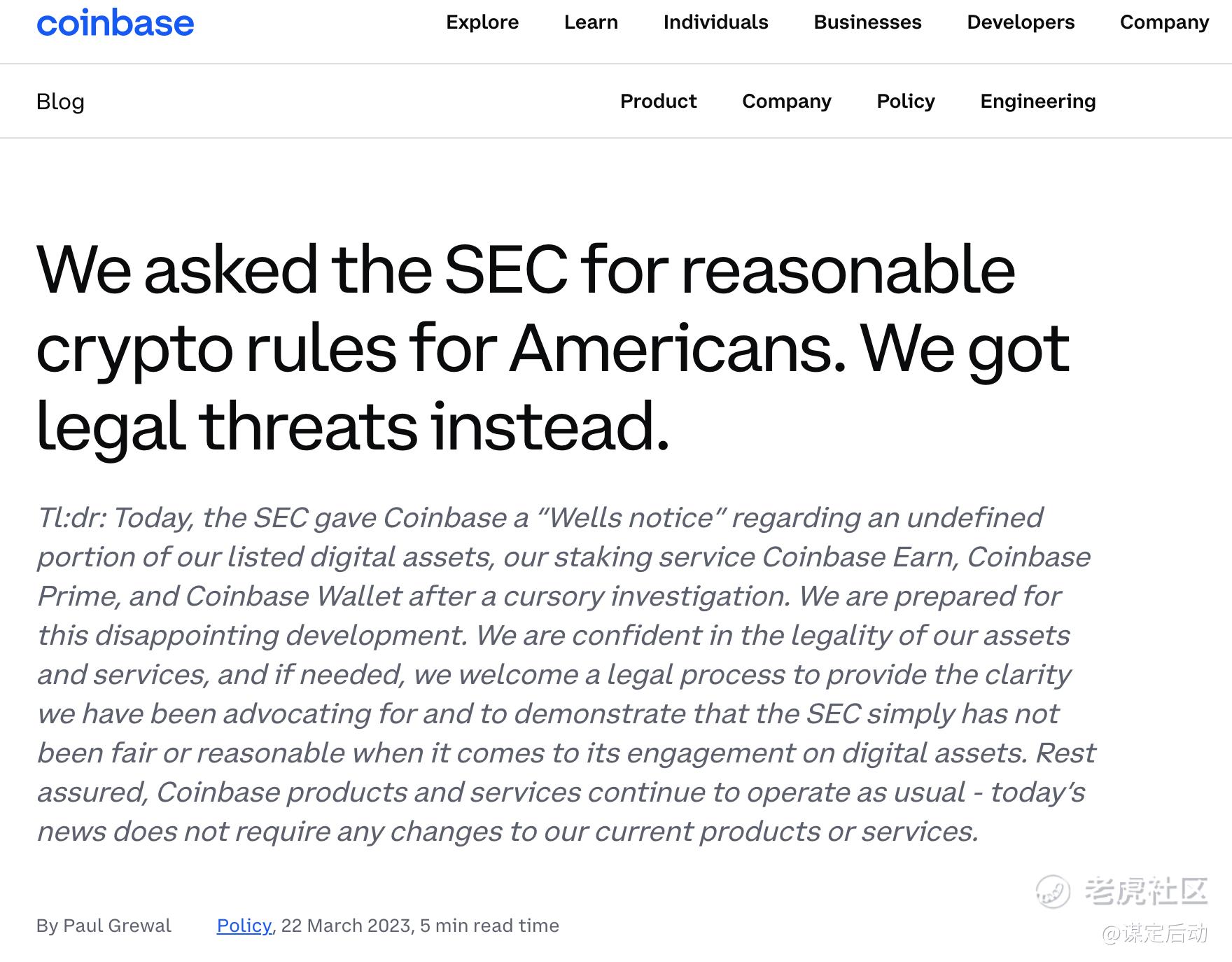 目前COINBASE的回应可谓是非常强硬,他们在网站上发布声明的标题是《我们要求美国证券交易委员会为美国人制定合理的加密规则,可是我们却受到了法律威胁》