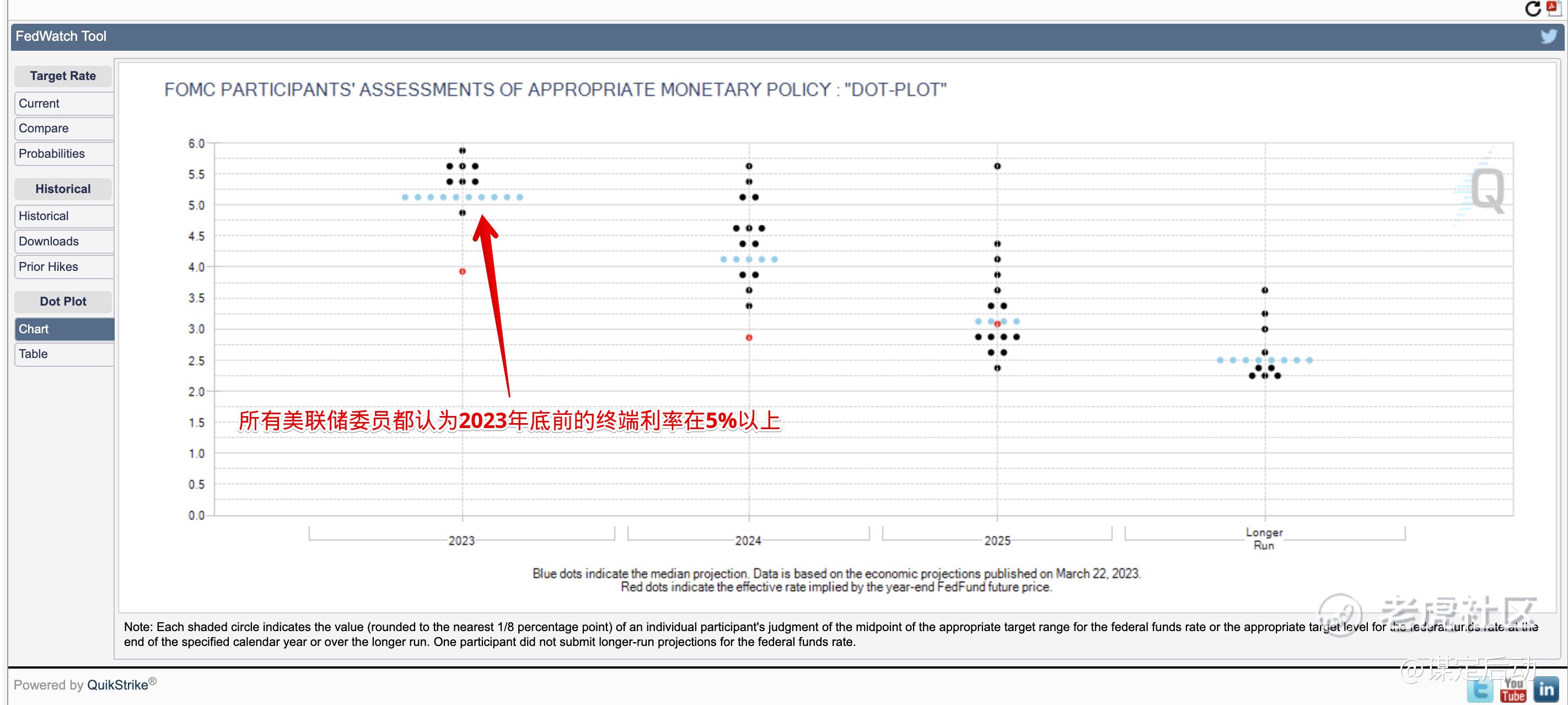 星期三议息会议以后,美联储公布的点阵图显示,2023年底之前不会降息。因为投票的17个委员预期年底前的利率峰值全部在5%以上。