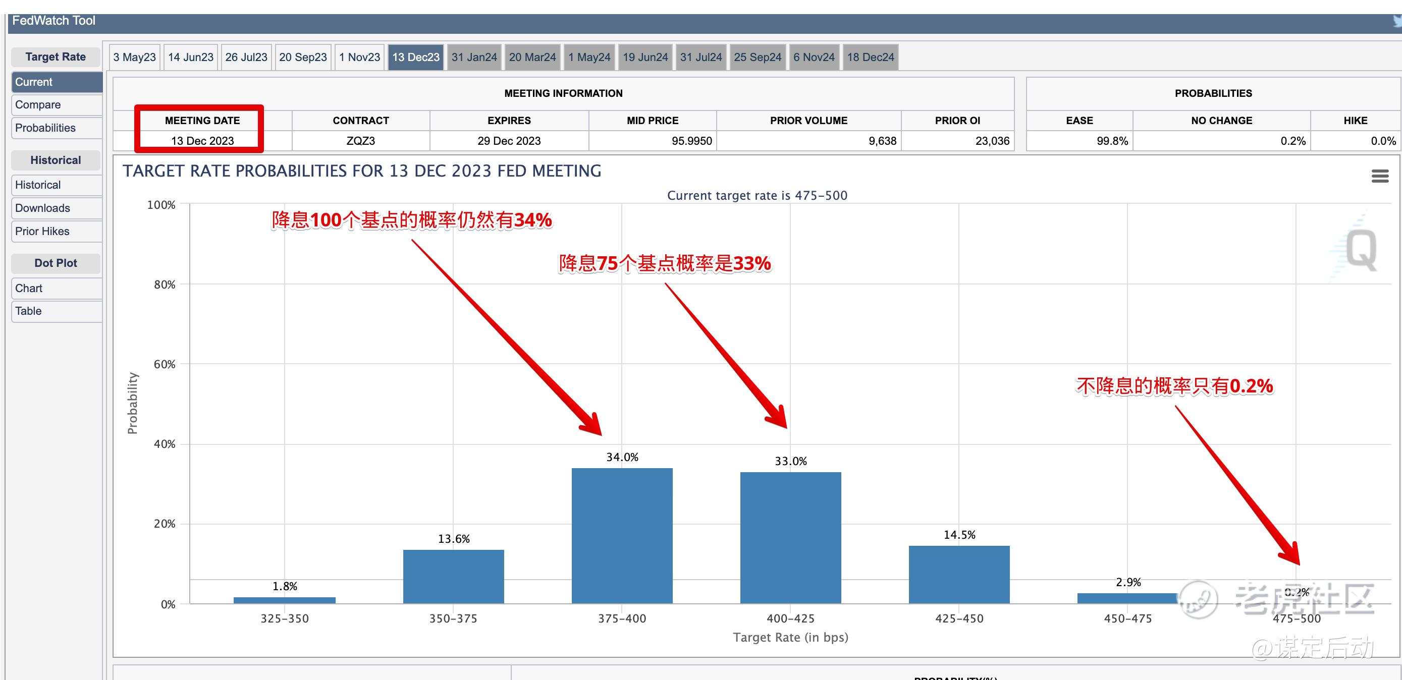 然而芝加哥证券交易所CME的工具显示,2023年底降息100个基点的概率是34%,仍然是所有可能性里最高的,和议息会议前没有变化。而不降息的概率仅为0.2%。
