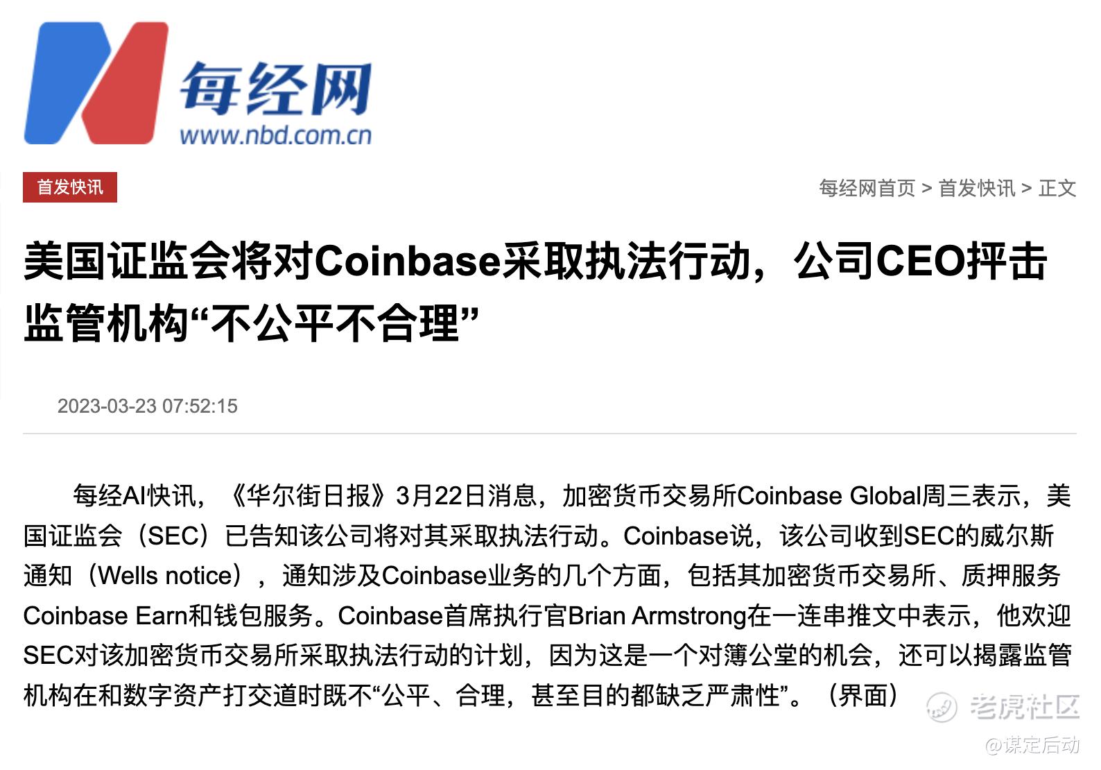 近期涨势凶猛的COINBASE被美国证监会当头一棒,说要被起诉。这让COINBASE一下子就抹去了一周的涨幅。