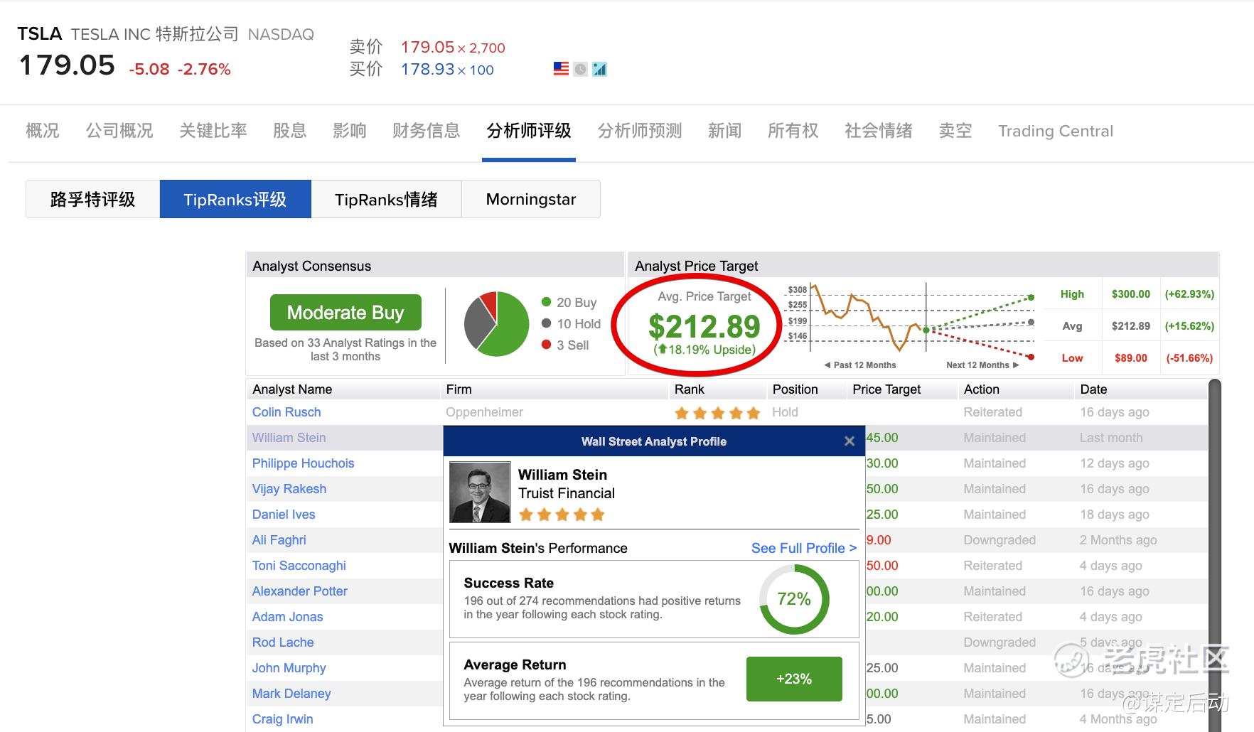 华尔街33名分析师给出12个月后特斯拉的股价均值是212,和现在179的价格比有大概20%的空间。