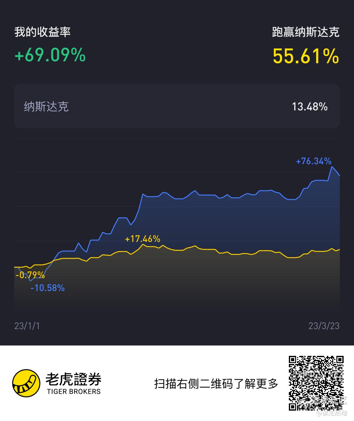 今年以来,我的账户收益率是69%,上周是64%,跑赢纳指的14%。