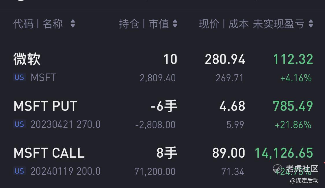接下来股市会进入一个相对沉闷的行情,对于微软这个票,我就一直买ATM的SP,等着能行权就好。行不到权接不到正股也没有关系,我手头上已经有8手LEAP CALL,要是上涨的话也是能吃到肉的。