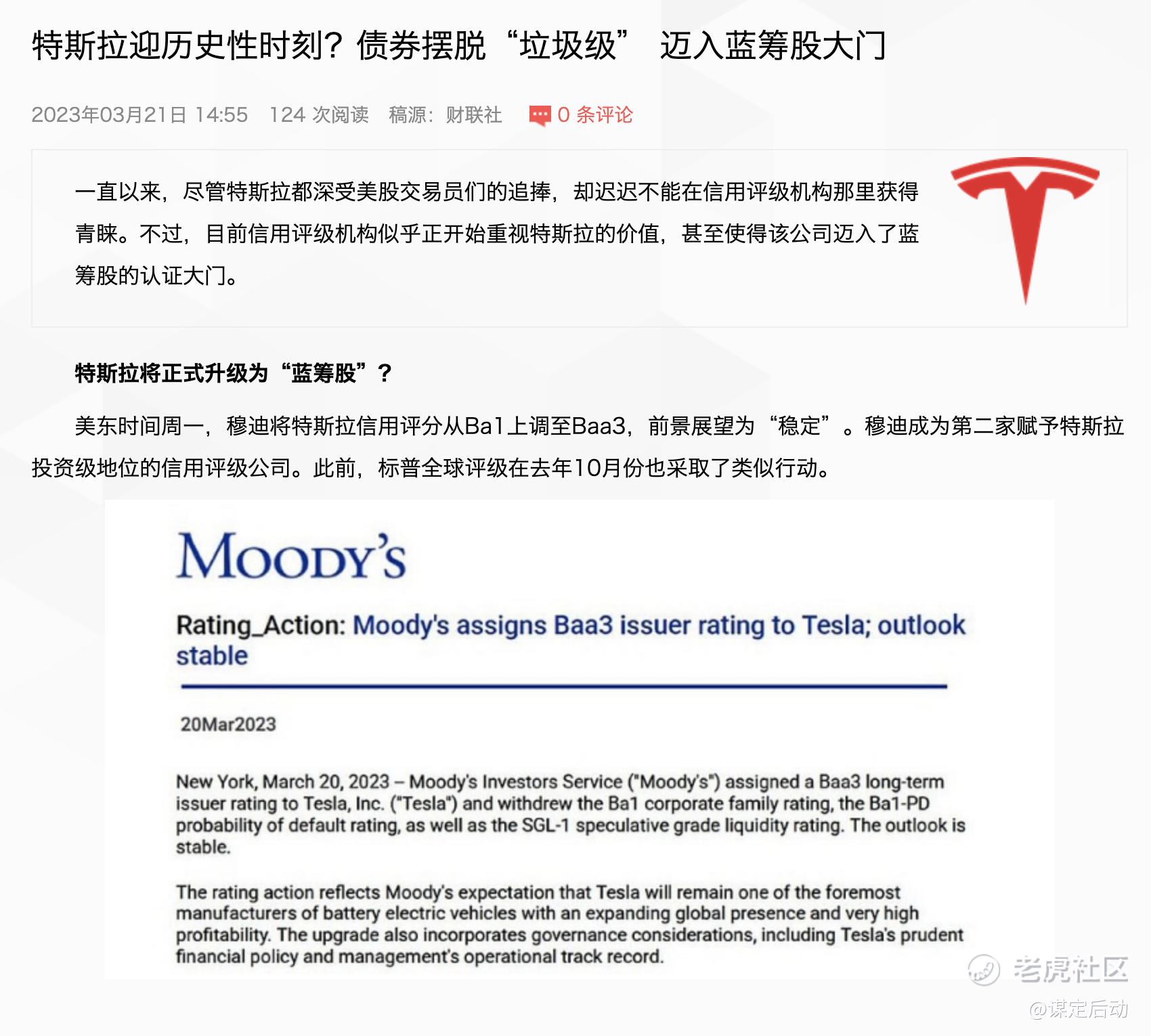 这段时间马斯克的新闻少了,对于特斯拉的股东来说,是个好事。被信用评级机构上调评级,从Ba1上调至Baa3,这意味着特斯拉发行的债券不再是“垃圾债券“而是“投资级”的债券了。实实在在的好处是,以后特斯拉对外融资的成本大大降低了。