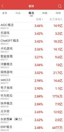 具体到上涨概念板块,领涨为AIGC概念、云游戏、ChatGPT概念、智能音箱、鸿蒙概念、WEB3.0等。