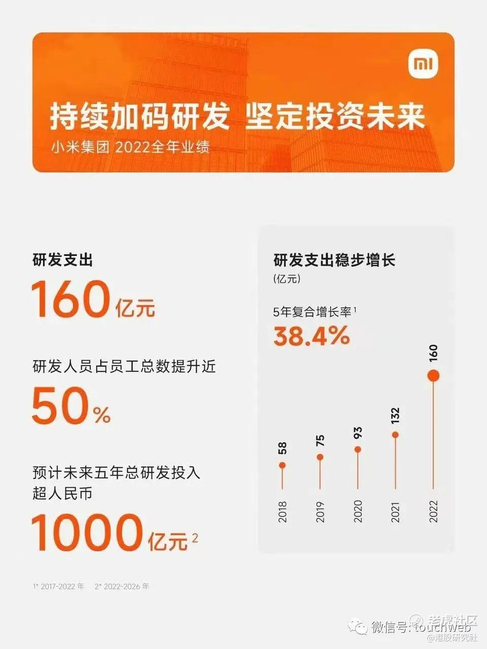 小米2022年研发支出达到160亿元,2017年至2022年复合增长率达到38.4%;预计五年(2022年至2026年)总研发投入将超过1,000亿元。截至2022年12月31日,小米研发人员在员工总数中占比约50%。