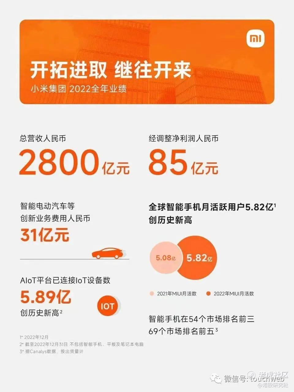 小米年营收2800亿:经调整利润85亿电动汽车业务投入31亿