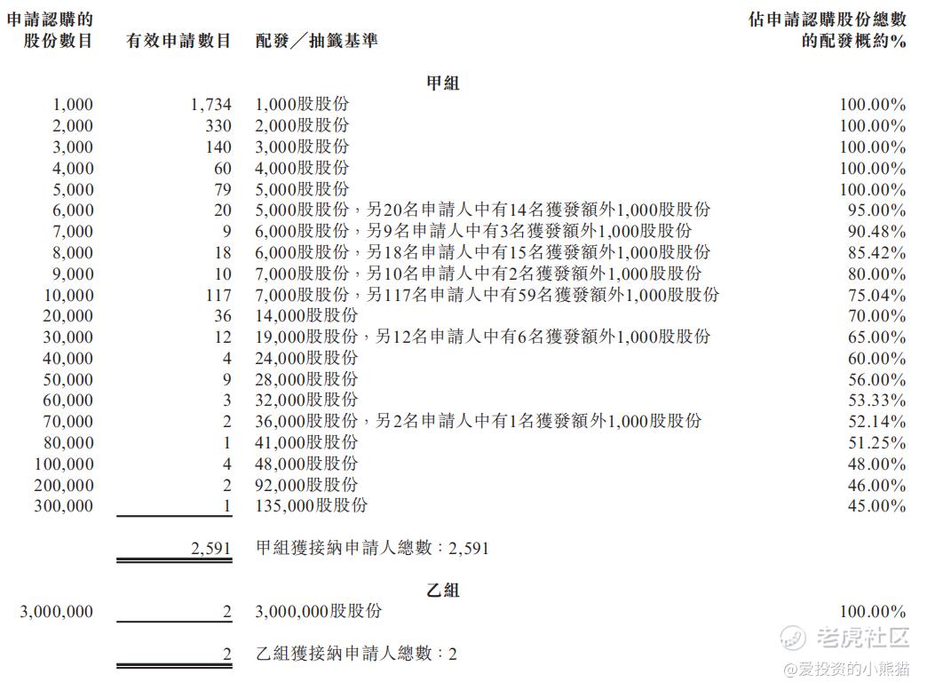 洲际船务 (02409.HK)下限定价3.27港元,4.09亿港元的募资,16.35亿港元的市值,发行比例25.00%,配售情况:2593人认购,这次公配1.14倍(甲组1.32倍,乙组0.96倍),算是相对冷了,没有超过15倍,无回拨,国配也有1.09倍,一手中签率100.00%,认购一手才必中一手,同时乙组有2人申购,无顶头槌申购,所有档位全都是百分百中签。