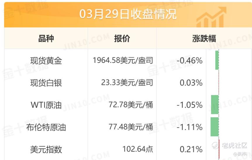 各位投资者大家好,今天是3月30日周四,昨晚经济数据持续强劲,黄金昨晚屡次冲击1970未果,最终以1964的价格收跌0.46%,避险消退持续影响市场,今日黄金下破1950概率较高,趋势线来看黄金正在处于确认下行方向阶段,美指方面,受昨日经济数据影响开始走涨,虽然昨晚一度出现V字行情,但仍稳站102上方,最终收涨0.21%。