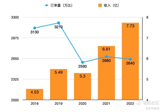2022年订单量2640万笔,对比最近5年情况,疫情三年对订单的影响比较明显,但从收入情况来看,仍保持较好的态势,2022年同比增长17%。