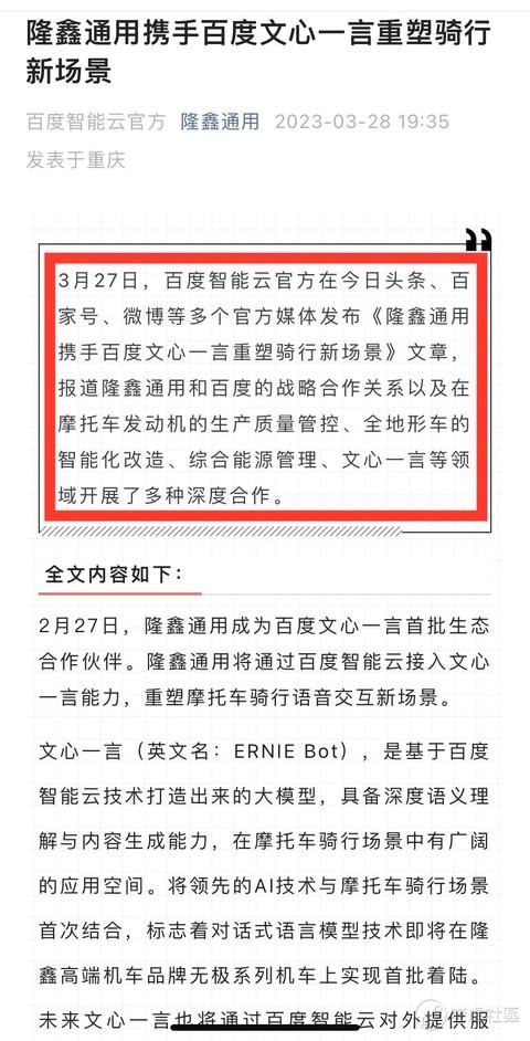 除了在骑行方面的智能语音交流和导航指引等,$百度(BIDU)$ 百度智能云还要和隆鑫$隆鑫通用(603766)$ 一起,在摩托车的生产制造、质量管理、研发知识积累等方面,应用上文心一言的能力,这样两者能去共同探索AI在制造行业的应用;隆鑫也可能会有望成为第一家搭载百度文心一言能力的摩托车企业,不仅会提供给用户更加智能化服务,先进化的服务,同时,还能和百度一起践行“用科技让复杂的世界更简单”的理念。