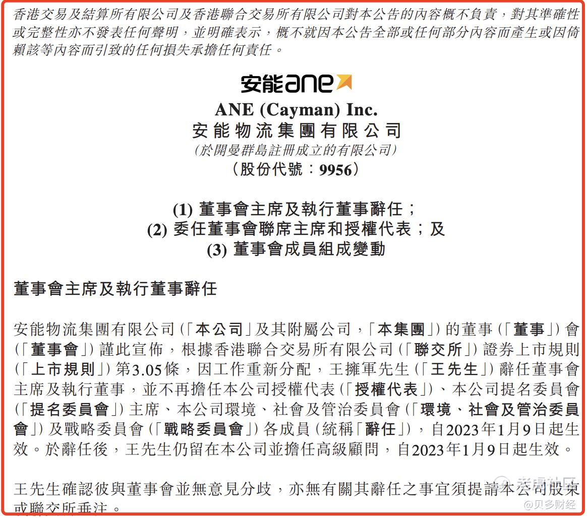 而在2023年1月9日,安能物流则发布公告称,因工作重新分配,王拥军辞任董事会主席(即董事长)及执行董事,并不再担任该公司授权代表等职务。于辞任后,王拥军仍留在该公司并担任高级顾问,自2023年1月9日起生效。