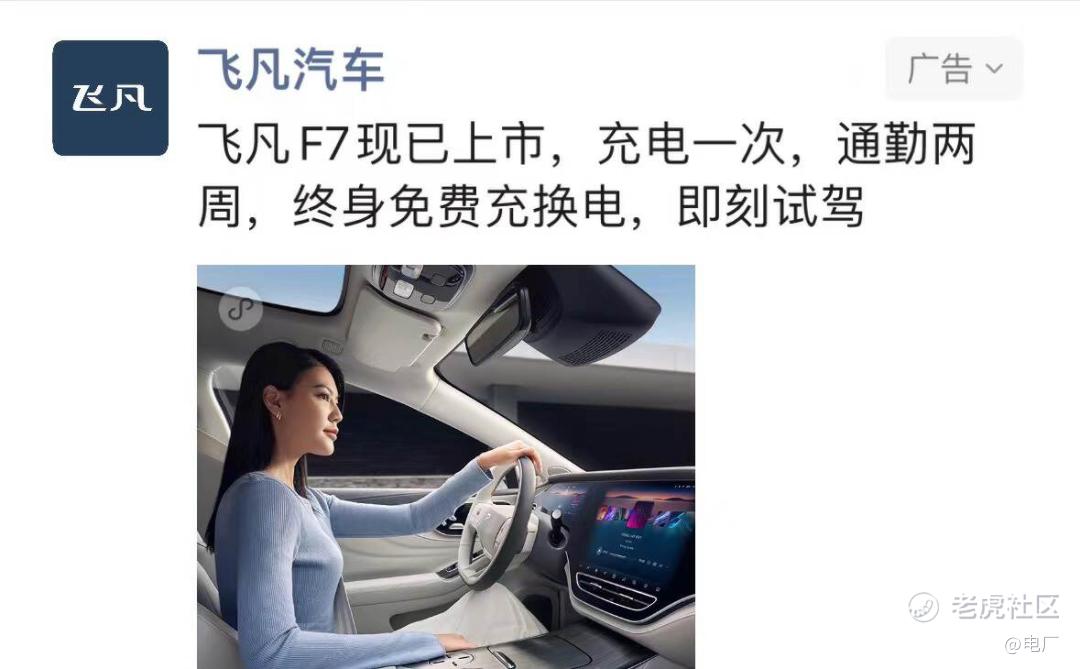 飞凡F7上市后,飞凡汽车在社交媒体大量投放广告加大F7的曝光。但作为一款支持换电的车型,F7主打的卖点却是“充电一次,通勤两周,终身免费充换电。”无疑是飞凡汽车在竭力回避换电服务的短板。