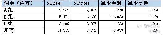 从佣金来看,联交所参与者2022年上半年佣金88.92亿港元,同比减少23%。各组别中B组同比减少比例最少,为-19%,A组和C组同比减少-26%。