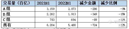 从交易量来看,联交所参与者2022年上半年交易量54.80万亿港元,同比减少12%。各组别中A组交易量同比减少比例最少,为-9%,B组交易量同比减少-15%。