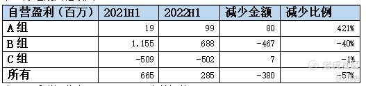 从自营盈利来看,联交所参与者2022年上半年总额2.85亿港元,同比减少57%。各组别中C组同比减少比例最少,B组同比减少最多为-40%。