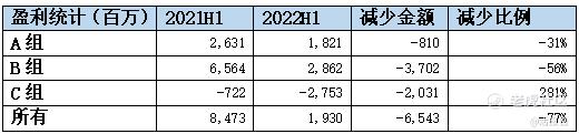 从盈利来看,联交所参与者2022年上半年净盈利19亿港元,较2021上半年85亿港币下跌77%。A组、B组、与C组经纪行上半年分别净盈利18亿港币、29亿港币和-28亿港币。如下表,各组别盈利较少形势逐级加重,A组盈利减少31%、B组盈利减少56%、C组亏损增加281%。