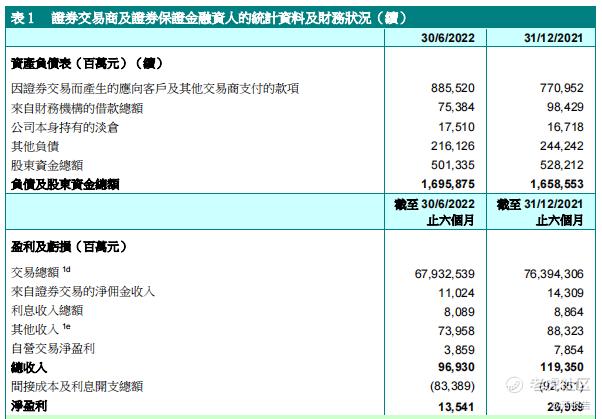 其中证券业的交易总额及来自证券交易的净佣金收入较之前六个月分别下跌11%及23%、利息收入较之前半年下跌9%、自营交易净盈利较之前半年下跌51%、其他收入较之前半年下跌16%。