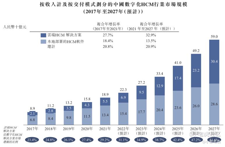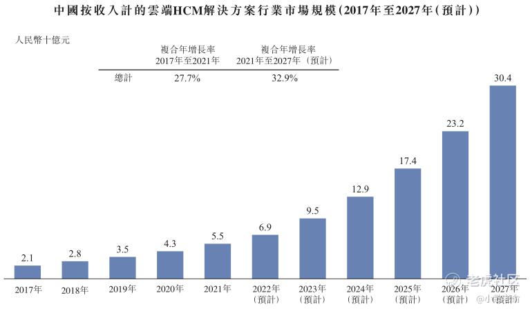 根据灼识谘询的资料,如下图所示,中国云端HCM解决方案市场规模从2017年的人民币21亿元增长至2021年的人民币55亿元,复合年增长率为27.7%,并预计将于2027年进一步增长至人民币304亿元,2021年至2027年的复合年增长率为32.9%。