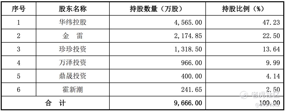 IPO前,华纬控股持股47.23%,金雷持股22.50%,珍珍投资持股13.64%,万泽投资持股9.99%,鼎晟投资持股4.14%,霍新潮持股2.50%。其中,金雷和霍新潮系表兄弟关系。
