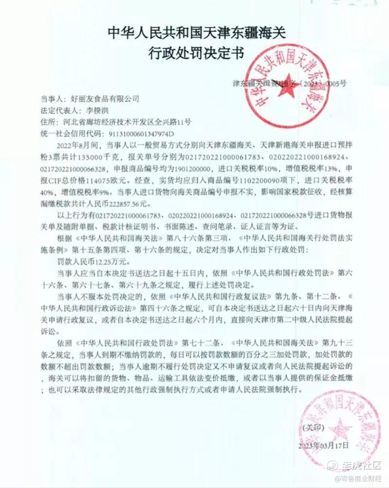 3月27日,好丽友食品有限公司因进口货物商品编号申报不实,影响国家税款征收,被天津海关罚款12.25万元。具体处罚事由为,2022年8月,当事人以一般贸易方式分别向天津东疆海关、天津新港海关申报进口预拌粉3票共计135000千克,申报商品编号均为1901200000,进口关税税率10%,增值税税率13%,申报CIF总价格11万余欧元。经核查,实货均应归入商品编号1102200090项下,进口关税税率40%,增值税税率9%,经核算,当事人漏缴税款共计人民币22.28万余元。