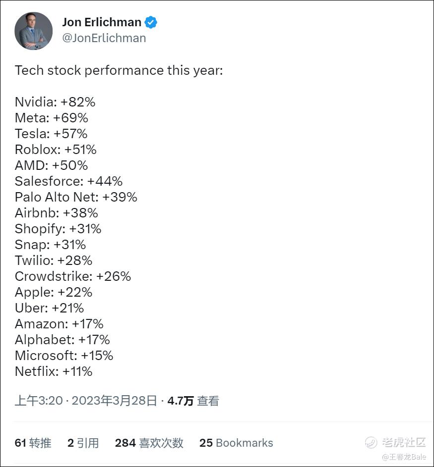 1.根据美国著名财经记者、投资人乔恩·厄利奇曼(Jon Erlichman)的统计显示,2023年美股科技互联网公司累计涨幅排名前十位的分别是英伟达(+82%)、Meta(+69%)、特斯拉(+57%)、Roblox(+51%)、AMD(+50%)、Salesforce(+44%)、Palo Alto Net(+39%)、Airbnb(+38%)、Shopify(+31%)和Snap(+31%)。而前五位的科技巨头,今年累计涨幅都超过了50%。