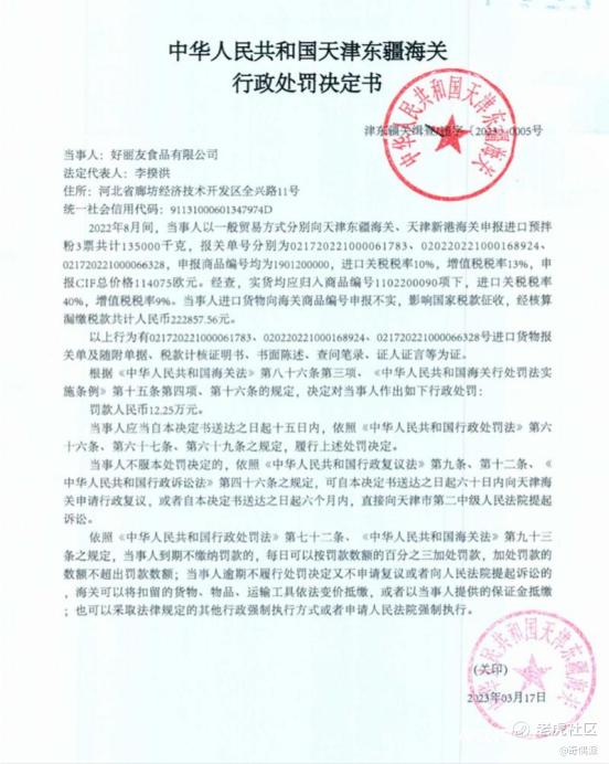 行政处罚决定书显示,2022年8月间,好丽友以一般贸易方式分别向天津东疆海关、天津新港海关申报进口预拌粉3票共计135000千克,申报商品编号均为1901200000,进口关税税率10%,增值税税率13%,申报CIF总价格114075欧元。
