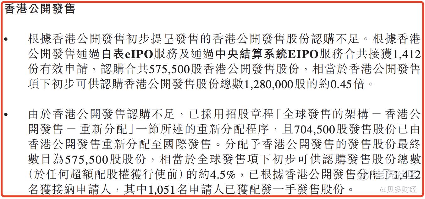 值得一提的是,达势股份在发售阶段并未获得公开认购。根据达势股份披露的发售价格及配发结果公告,其在香港公开发售部分的认购不足,共有1412人认购,认购合共575,500股,相当于香港公开发售项下初步可供认购总数的约0.45倍。