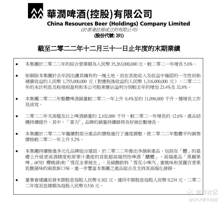 【华润啤酒:2022年全年净利43.44亿元 同比下降5.30%】华润啤酒(00291)发布2022财年年报。公司在2022年1月1日-2022年12月31日实现营业收入352.63亿元,同比增长5.62%,归属母公司净利润43.44亿元,同比下降5.30%,基本每股收益为1.34元。(公司公告)