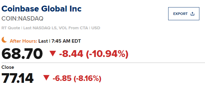 向下跳空:COIN -11%, CHWY -5.7%, CDTX -5.3%, MLKN -4.1%, MANU -3.8%, PHR -1.8%, EXEL -1.3%, CSX -0.8%, IONS -0.7%, MDRX -0.6%