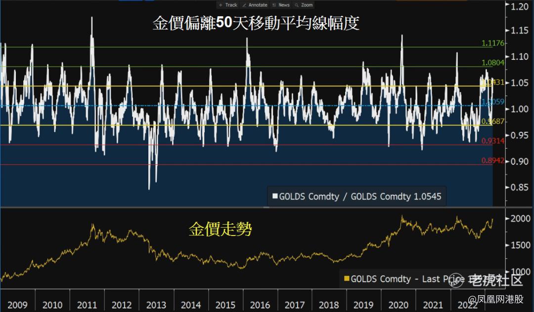 短期而言,黄金继续担当避险资产的角色,若然当前银行金融危机发展续出现震荡,在资金流向带动下,金价相信还有进一步夹高的空间;惟需留意的是,经过一轮攀升后,金价已稍为超买;现价高于50天移动平均线约5.4%,相当于金融海啸后至今平均值加1.3个标准差。不过,从过去逾14年金价抛离50天线的表现,可见在一些较强的反弹或升浪市况中,金价往往可高于50天线8%、甚至17%以上,相当于高于平均值两个和3个标准差(图)。纯粹按此标准推算,金价这轮的升势,将可望挑战2040美元、甚至2110美元以上水平。
