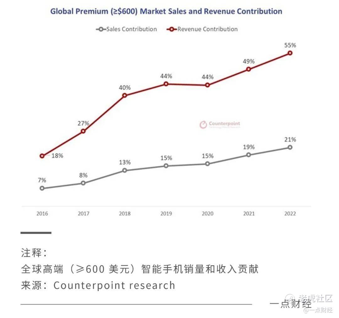 用户这种“尝新需求”,也成为高端手机市场持续保持增长的理由。Counterpoint research 3月21日发布的数据显示,虽然2022 年全球智能手机整体销量同比下滑了,但是全球高端(≥600 美元)智能手机销量却同比增长了1%,使得该价格段有史以来首次占据了全球智能手机市场总收入的55%。 其中,1000美元以上是2022年增长最快的价格段,销量同比增长38%。