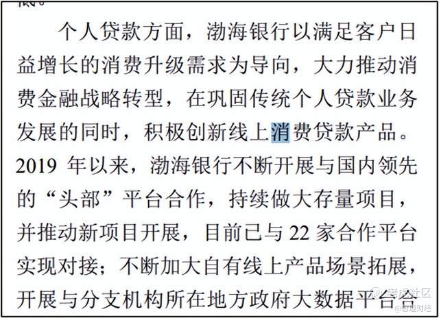 例如,2017年初,渤海银行推出在线消费金融产品系列“渤乐e贷”,额度最高30万元,贷款期限为1个月至36个月。截至2017年、2018年及2019年末,“渤乐e贷”发放的个人贷款余额分别为6.29亿元、11.83亿元及9.28亿元。