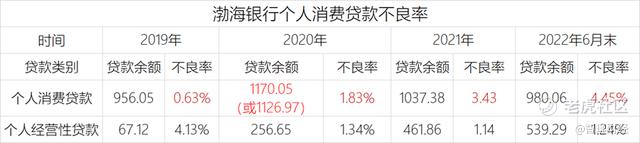 截至2019年末、2020年末、2021年末和2022年6月末,渤海银行个人消费贷款不良率分别为0.63%、1.83%、3.43%和4.45%,不良率连续走高,凸显渤海银行互联网贷款业务风控能力不足,资产质量堪忧。