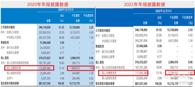 此外,渤海银行在个人消费贷款数据披露方面不严谨,年报数据前后矛盾。例如,2020年报披露的2020年个人消费贷款余额为1126.98亿元,但2021年报中披露的2020年个人消费贷款余额又变成了1170.05亿元,凭空增加了43亿元。