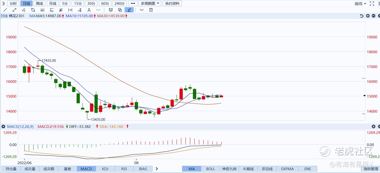 日线级别走势分析:棉花2301合约走势较为震荡,始终围绕15000上下200震动。日内60分钟级别站上15000点位上方,上方保留较长的上影线,近期走势有望利多。