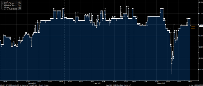 今天早上本来写了对于今天Powell讲话的前瞻,但是因为中概股的事情就没发。和本周一预测一样,我认为今天Powell什么信号都不会释放,会打太极,事实上他也确实什么都没说。最直接的证据,就是9月加息的概率,依旧是60%。下图是过去3天的概率变化,非常稳定,只有他讲话那一瞬间的闪跌。