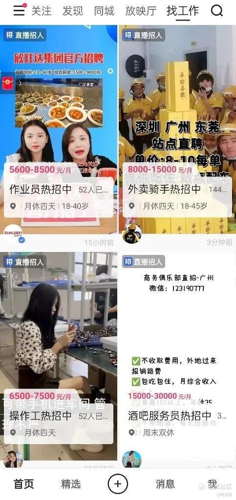 今年1月,快手正式推出了快招工新业务。在快手首页,“找工作”和顶部的关注、发现、同城并列为一级入口,可见新业务在快手的战略地位并不低。