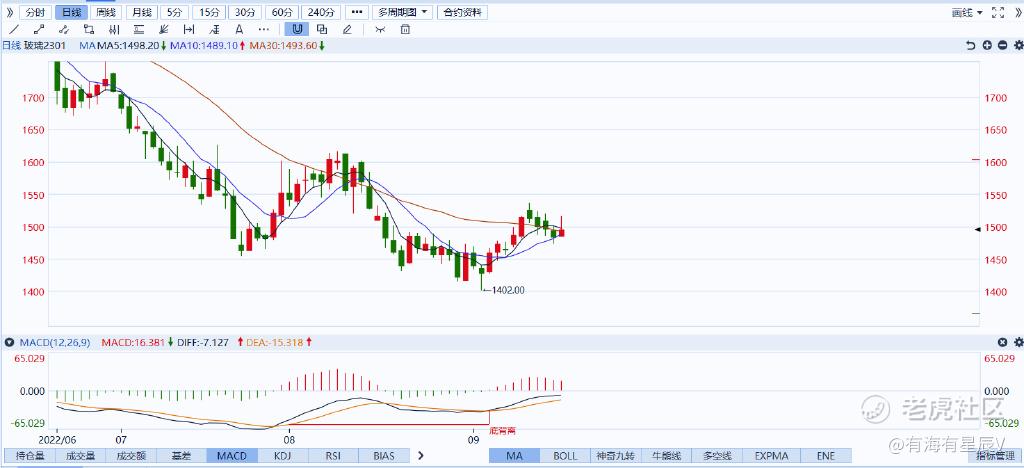 观察上方玻璃2301主力合约日线级别走势图来看:上周跌破1500后今天高开反弹没能回到1500上方,说明1500这个点位反向构成压力,均线上也发生 了回调,虽然下方MACD给出底背离趋势,但是走势较缓,没有很强劲的上升势头,近期对玻璃走势依旧保持看空。