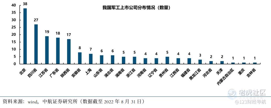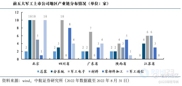 军工企业集群效应明显,北京、四川、广东、陕西及长三角地区比重较大