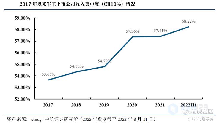 从军工上市公司收入(2021年)分布来看,收入在300亿元以上的公司共有6家,分别是中国船舶、中国重工、楚江新材、航发动力、中航沈飞以及中航西飞,大部分为主机厂。军工上市公司收入主要集中在10亿元以下,占比为43%。2017年以来,军工上市公司收入集中度(CR10%)不断增长,由2017年的53.65%增加到2022H1 的58.22%,10%数量的公司收入规模占比近60%。
