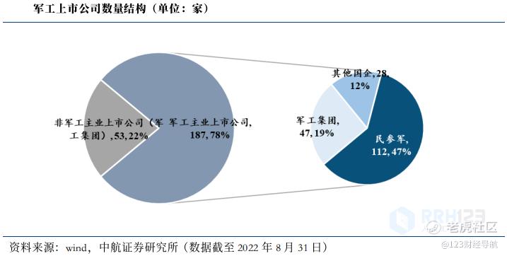 广义的军工上市公司(数量240家)包含了53家军工集团下属非军工主业公司,本文讨论分析的军工上市公司主要为军工主业上市公司(187家),其中军工集团军工上市公司47家,其他国企类军工上市公司28家,民参军上市公司112家。