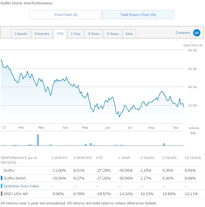 GURU 跟踪一个等权重指数,该指数试图模仿大型对冲基金持有的集中股票头寸。