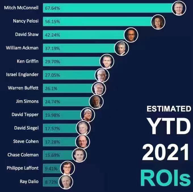 与此同时,第三方机构Open Secrets指出,2021年,多位美国国会议员的“炒股战绩”甚至比表现亮眼的标普500指数还要好。其中,佩洛西夫妇的投资回报率(ROI)在所有议员家庭中位居第二名,高达56.15%,不仅超过美国顶级的对冲基金经理,甚至远超股神巴菲特、华尔街“精算之王”大卫·肖等人。更夸张的是排名第一的参议院共和党领袖麦康奈尔,其投资回报率接近68%。