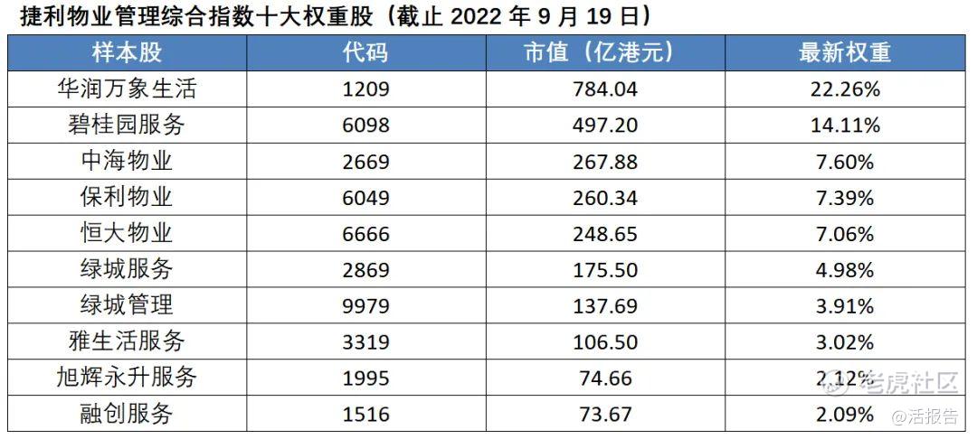 截至2022年9月19日,捷利物业管理综合指数前十大权重股的总市值约2626亿港元,占总指数市值的比重约为75%。