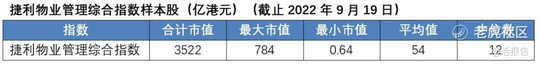 截至2022年9月19日,捷利物业管理综合指数的样本股共计65只,最新累计市值约为3522亿港元。