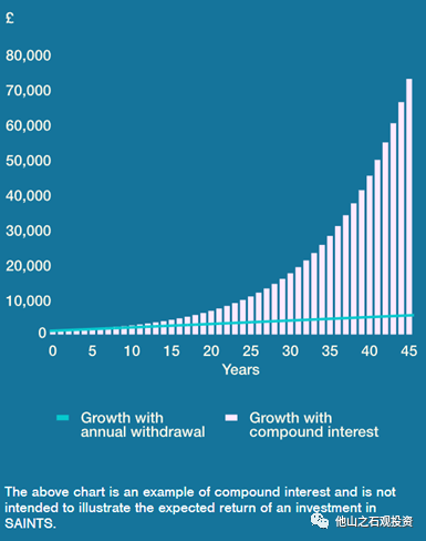 假设两个人都以10%的年利率投资1000英镑的资产。一个提取每年100英镑的收益,只留下原始金额,另一个依然将利息放入投资。45年后,前者将有5500英镑,后者则有超过72890英镑。
