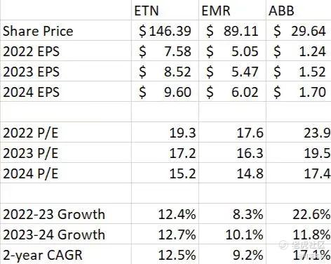 与市值相近的同行相比,伊顿比EMR贵,比ABB便宜。由于伊顿两年的增长率介于这两家同行之间,分析师认为伊顿目前的估值相当合理。